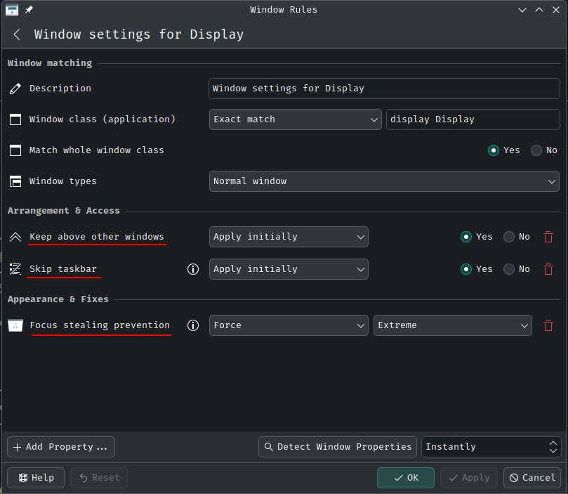 There are still minor issues, that we only know how to fix on KDE Plasma. Right click on the image window > Special Application settings... > and do the changes in the screenshot. These changes would allow to: